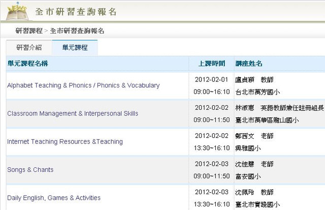 研習名稱:100學年度臺北市國民小學英語領域教師關鍵能力研習班主辦單位:臺北市教師研習中心 研習時數:18