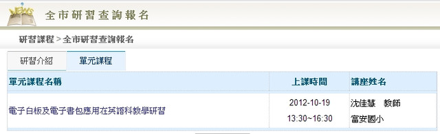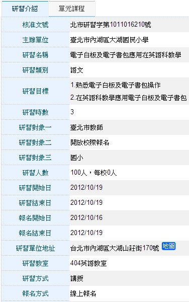 [研習] 電子白板及電子書包應用在英語科教學 北市研習字第1011016210號 臺北市內湖區大湖國民小學 內湖區大湖山莊街170號 404 英語教室 10/19 (Friday) 13:30-16:30